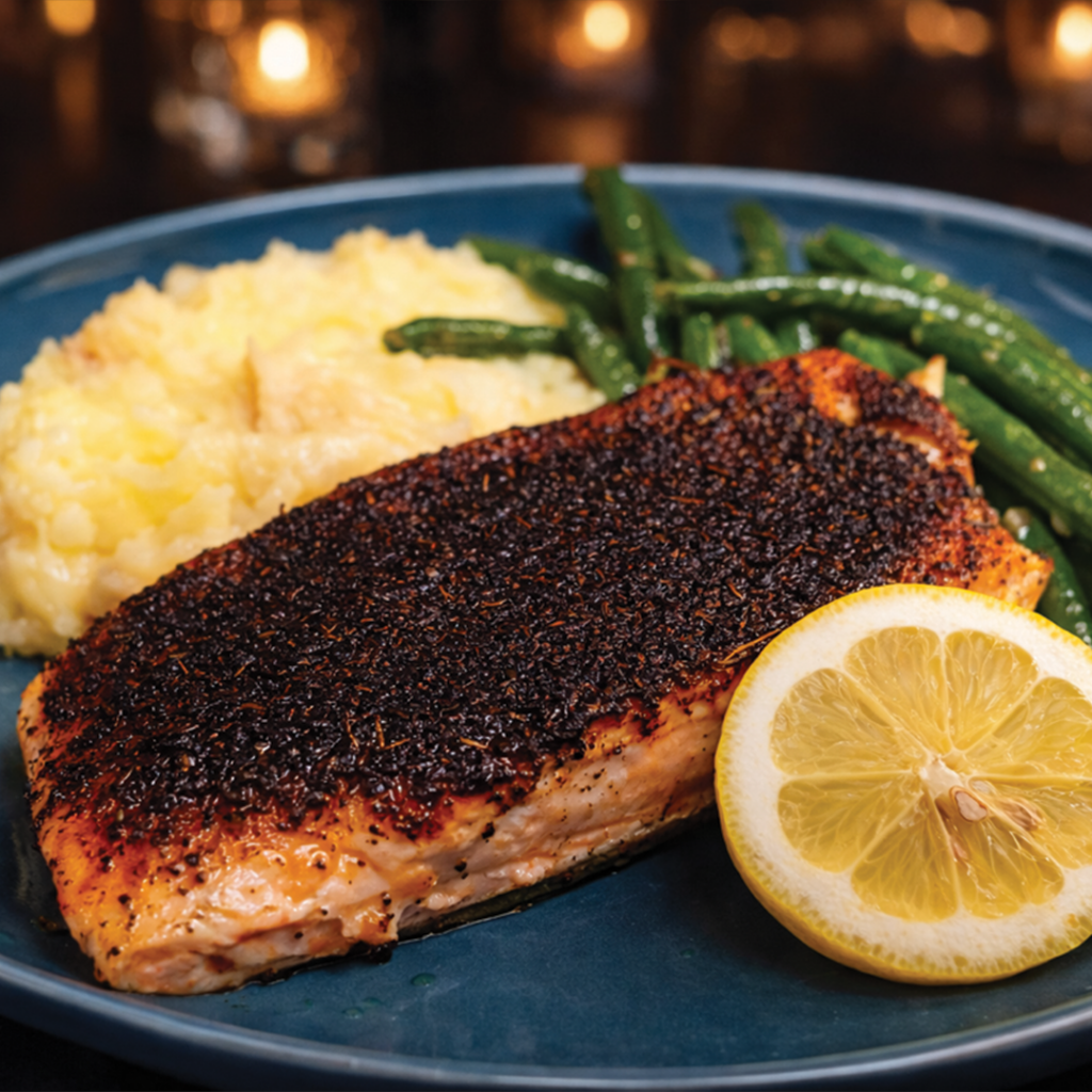 3 Tacos with Blackened Salmon, Pico, freshly made Slaw, Corn Salsa, Hot Honey